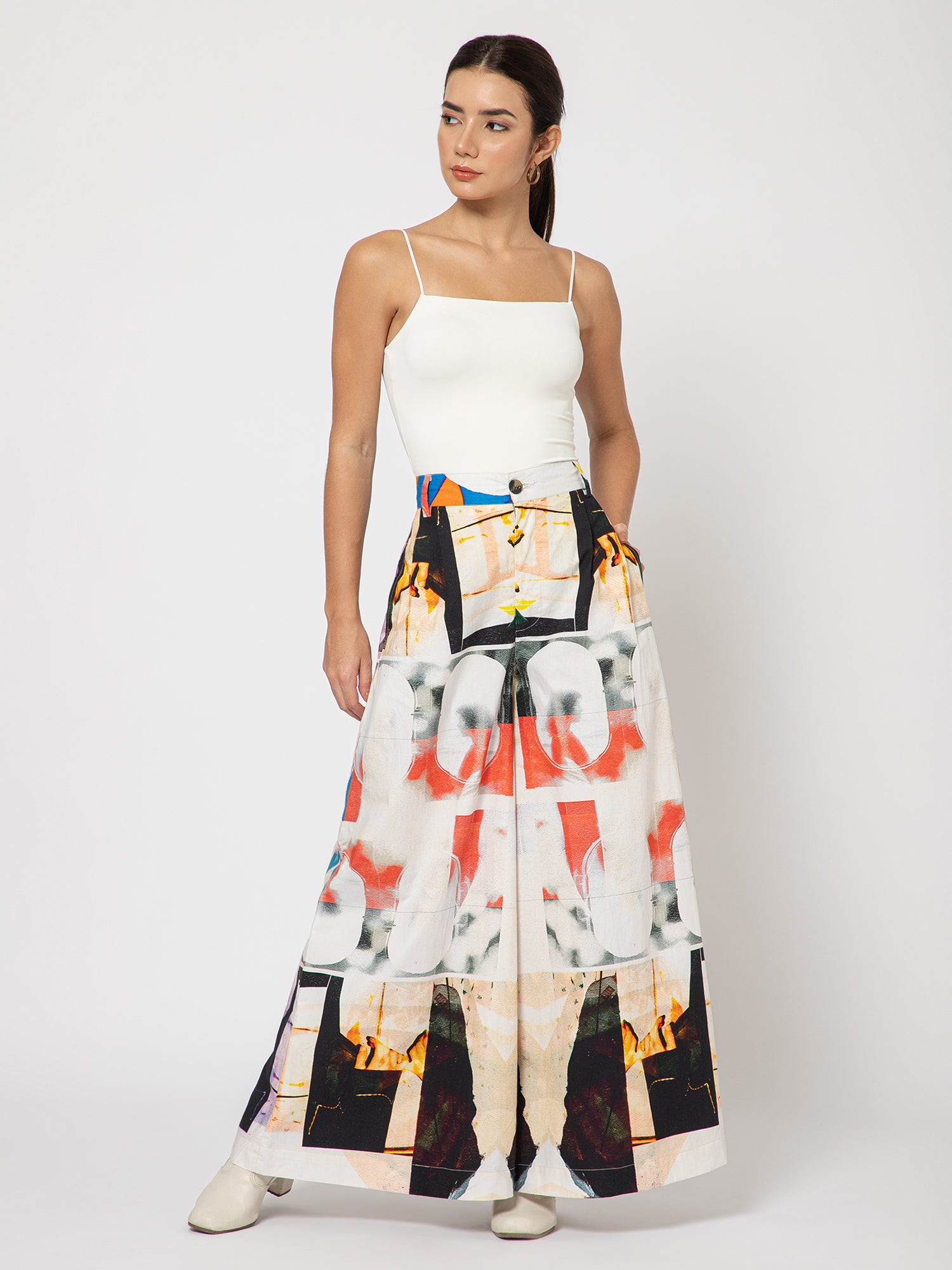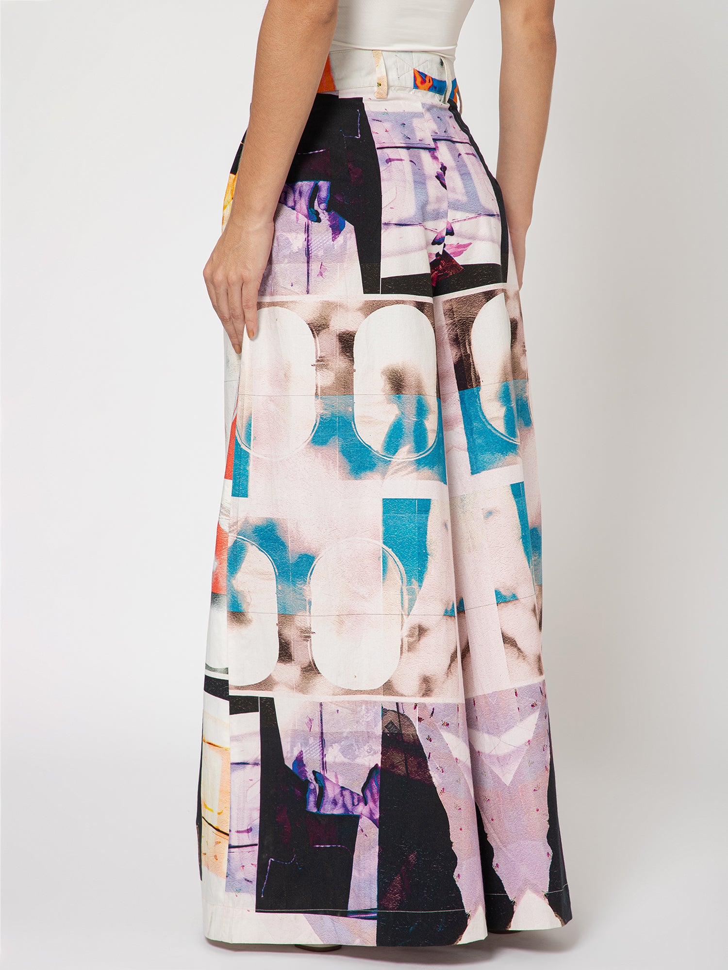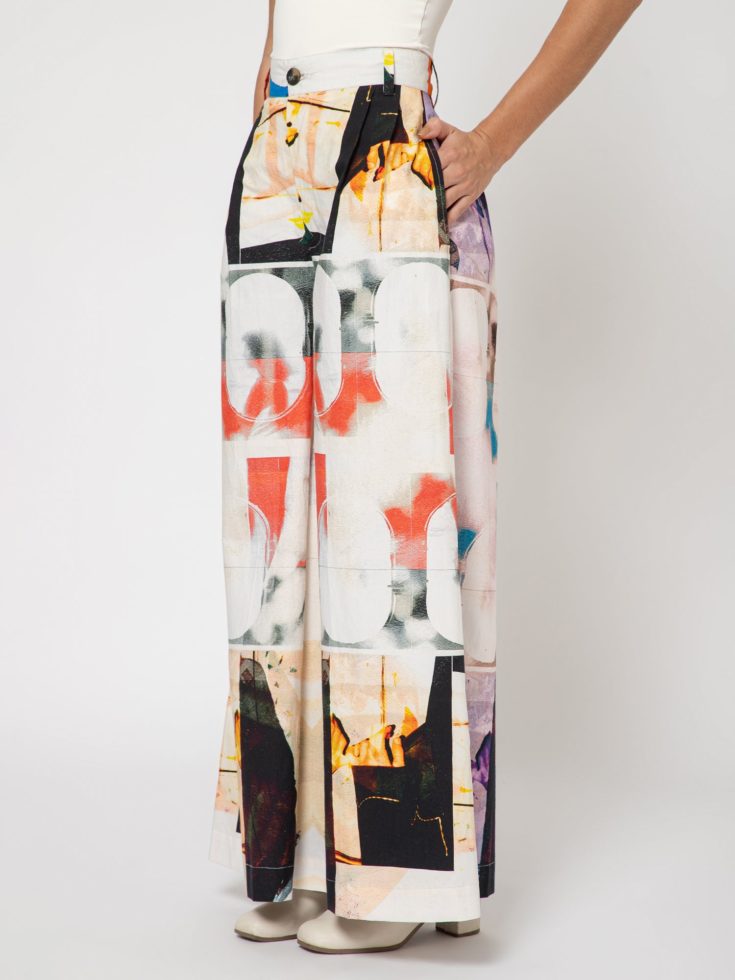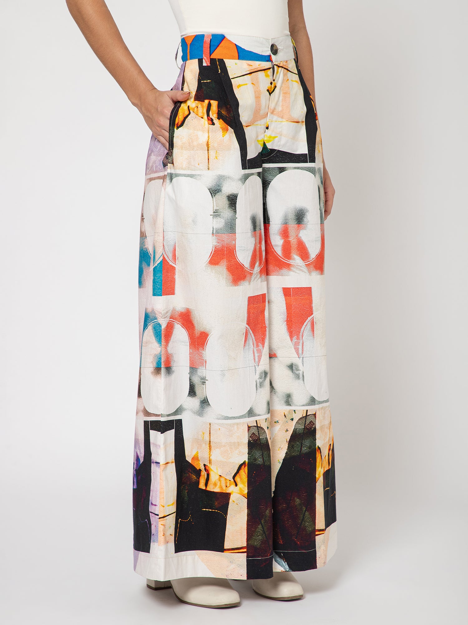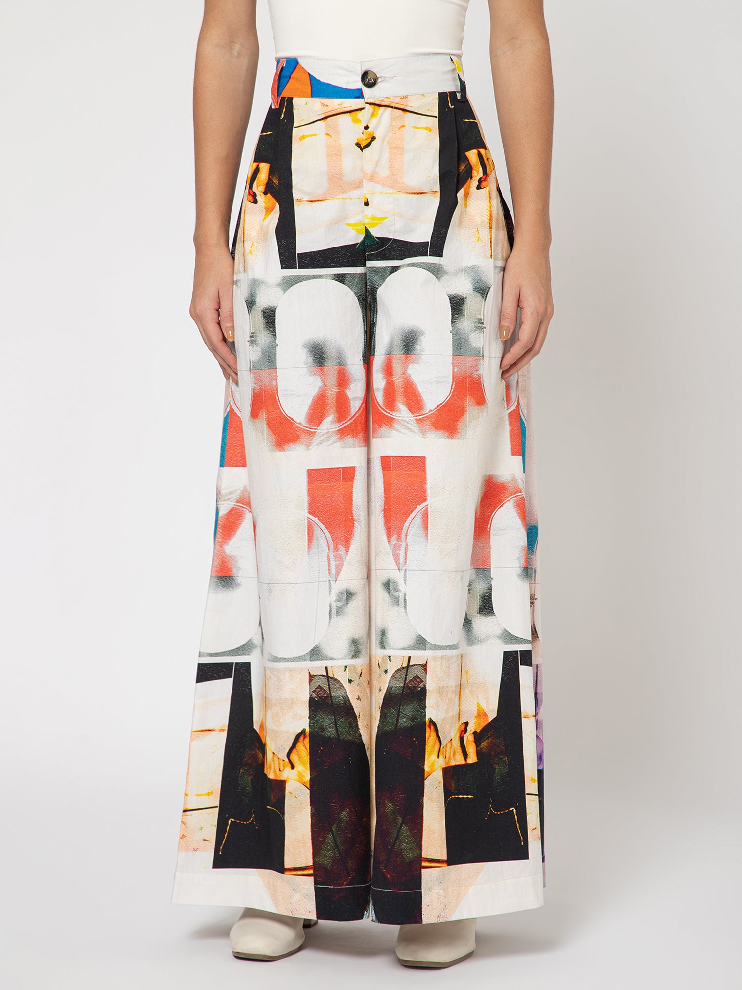This trouser captures the tender tension between two lovers — seated apart, eyes meeting across the divide. One panel tells her story, filled with curiosity and warmth; the other holds his quiet pause, lost in thought. Together, they form a dialogue of love, silence, and unspoken emotions. The artwork flows seamlessly across both legs, turning the fabric into a cinematic frame of intimacy and longing.